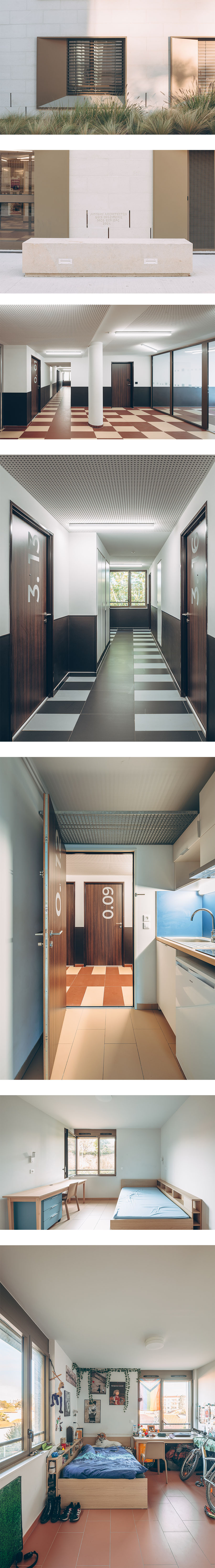 Le projet présente une volumétrie compacte et ramassée qui limite son impact sur les avoisinants. Les 72 studios sont répartis sur 4 niveaux et se répartissent de part et d’autre d’une circulation rectiligne large et traversante.