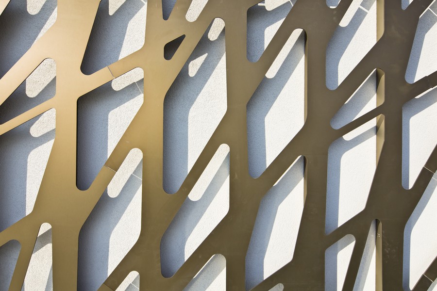 Sur l'extérieur, une protection mécanique en métal texturé vient habiller cette peau et sur la cour ce sera une vêture prismatique réfléchissante réalisée en tôles d'aluminium pliées. Perforées, ces tôles fonctionnent comme des baffles absorbants pour faire de la cour commune un espace agréable à vivre et à partager.