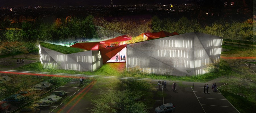 Overall, the project is conceived according to a principle of combinations and symbioses of materials, forms and uses. Their volume and exterior envelope differentiates the artistic creation and performance areas from the administration/meeting areas. The façades of variables height along the main access road are in concrete ponctuated with neon lights for the artistic creation and development structures and in canten Indaten steel (corrosion-resistant self-sheening steel) for the administrative and meeting buildings. The constructions are composed of multiple triangular facets, alternating surfaces in Indaten steel, micro-perforated steel, concrete and glass, with the effect of creating an irregular variation of exterior and interior façades in a state of perpetural change.