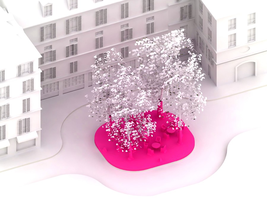 Péripheriques Archtiectes agency was invited to intervent on the Furstemberg square within the second edition of the Exposition of contemoirary art in Saint-Germain-des-Près/ Parcours/ Paris-Soho which took place from the 28th of May to the 18th of June 2002 and was organised by the Saint-Germain-des-Près committee. It is about a “plastic” intervention in order to “transform” the square in an attitude of “preservation”. PINK GHOST was implemented in a rose-coloured resin wraped around four trees and a street lamp up to 2m50 covering also the square's total surface. While making the installation, we have cleverly slided under the resin twenty or so chairs and five coffee tables. This exterior urban place (the square) have then become an (interior) exterior lounge and was suddenly questioning the status of the public space in the city.Once uninstalled in Paris, Pink Ghost was rebuilt in the french pavilion at the architectural biennale in Venise, as the memory of a square and it's new use.