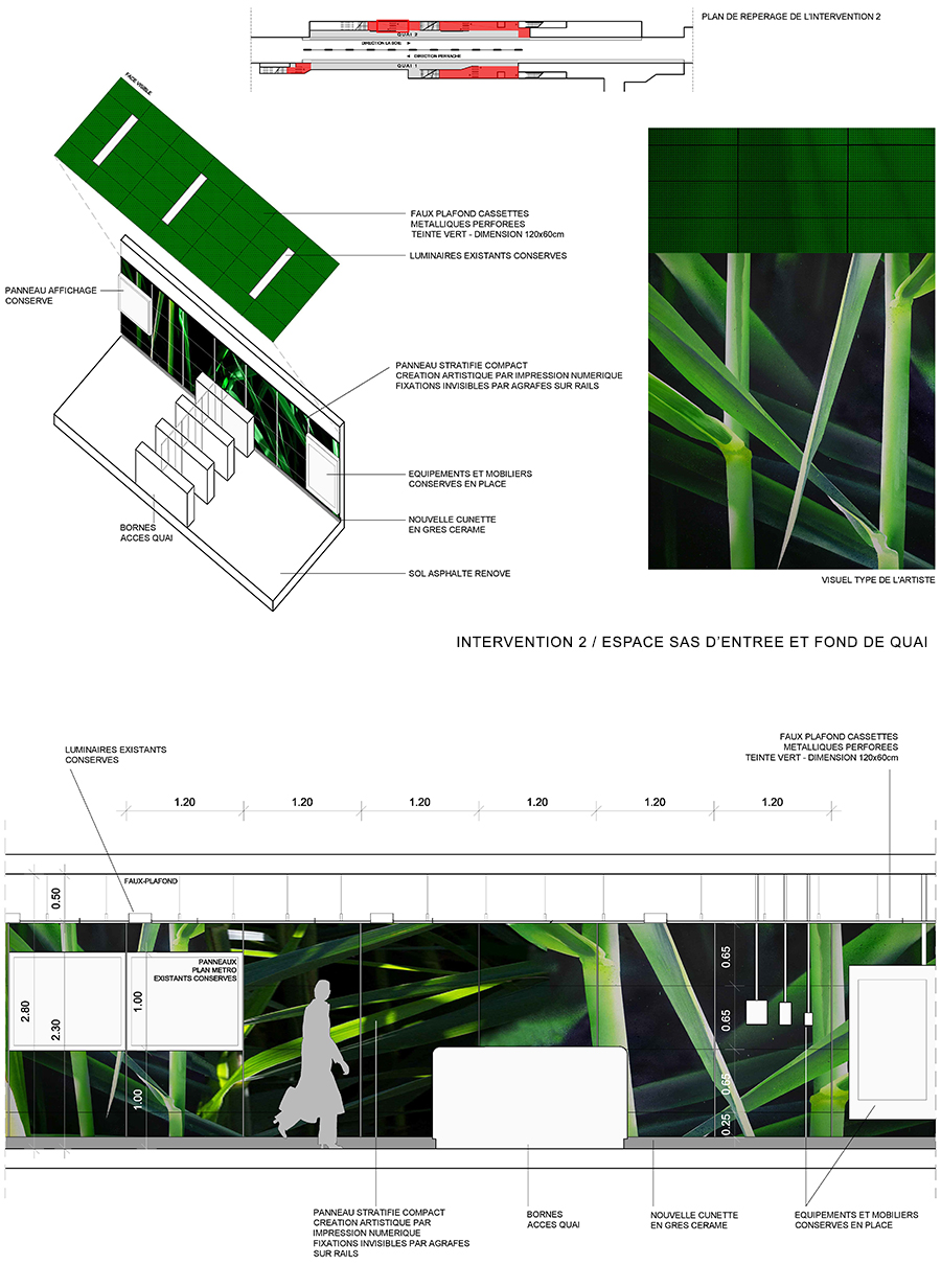 La rénovation de la station s’articule et s’immisce dans tous les espaces de la station où ces natures envahissent l’espace qui devient végétal, sauvage, luxuriant. L’intervention artistique touche tous les espaces de la station, usant de techniques et de médiums différents. Dans les zones de descente/montée, le by-pass et le mur central, des peintures murales, fresques, seront réalisées directement sur place par l’artiste. Les façades des quais et fonds de quais seront habillées de panneaux de résine imprimés numériquement. Une installation multimédia est proposée dans l’espace du by-pass en complément de l’intervention sur les murs.